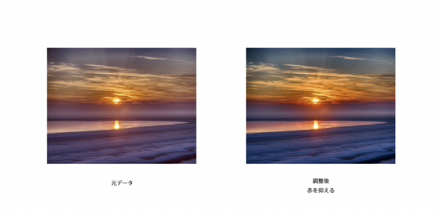 そのため、あえて赤やオレンジと相反する色(シアン、ブルーなど)を入れて色を抜くことによって余分な赤色を排除して本来の夕焼け色を際立たせる調整を行うこともあります。