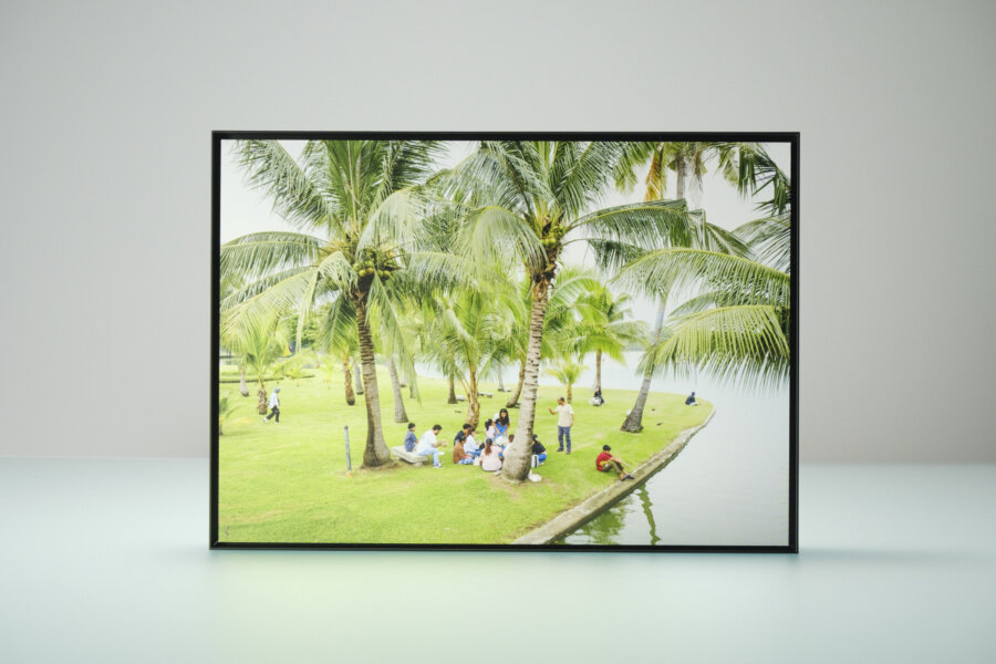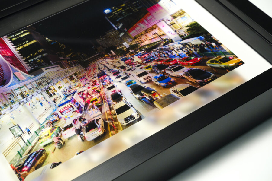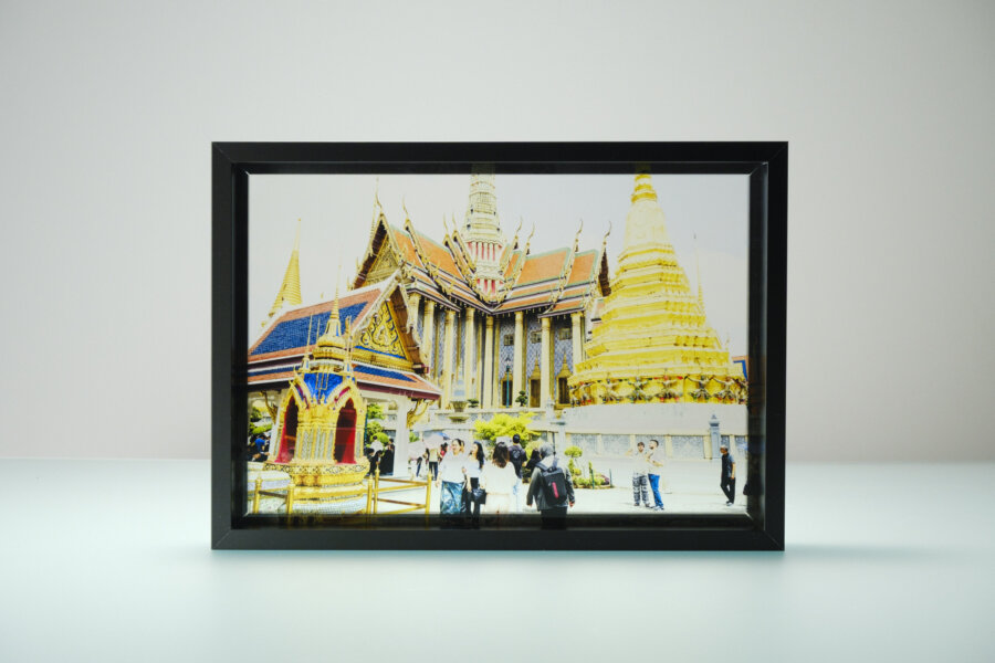 また、FLATLABOではグレージングバックと呼ばれる額装方法でもよく使用します。UVプリントアクリルをフロントスリットに、白いボードをバックスリットに額装することで作品が浮いているように見えます。アクリルの全面に絵柄をプリントせず、あえて中央にレイアウトすることで影が落ちますので、より効果的な仕上がりとなります。カラーはブラック・シルバーよりお選びいただけます。