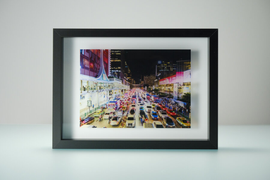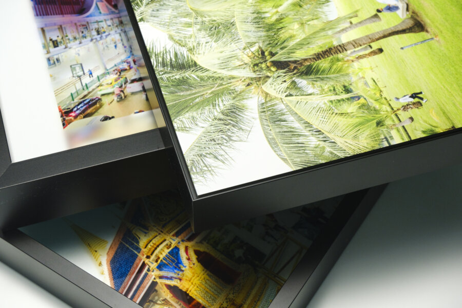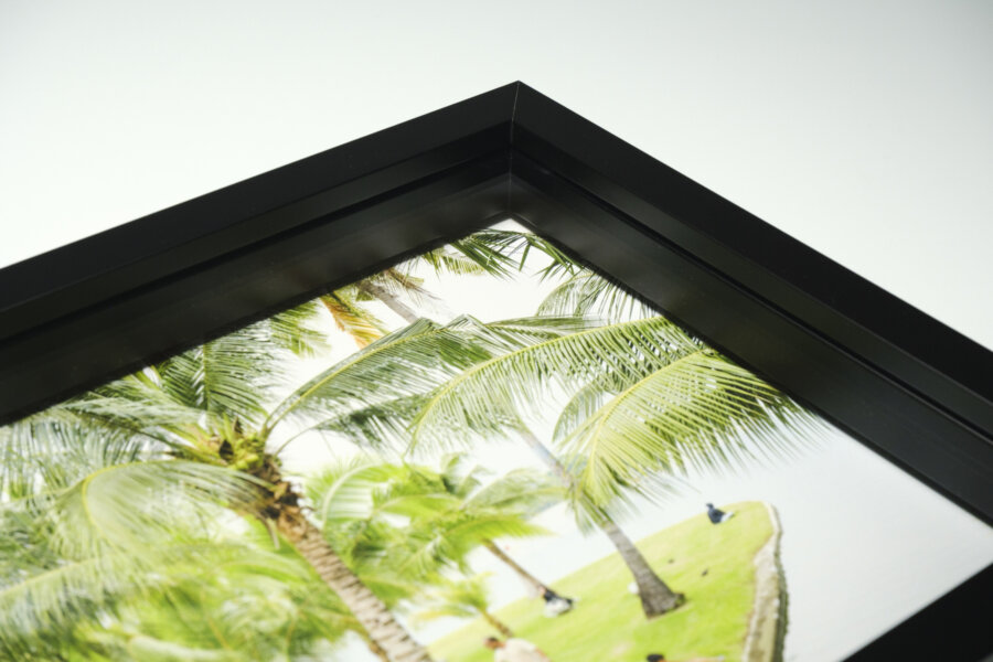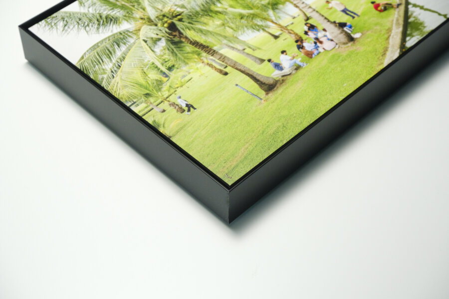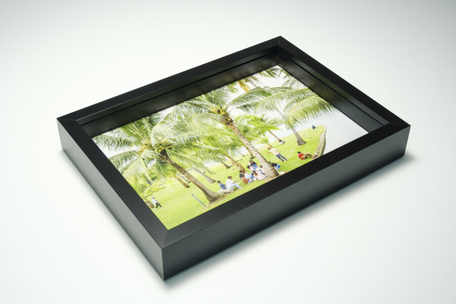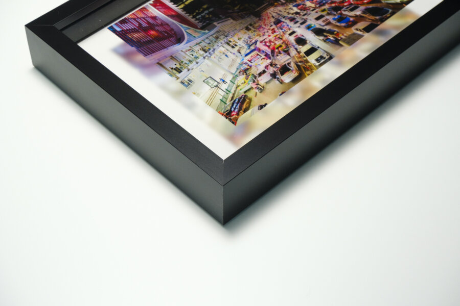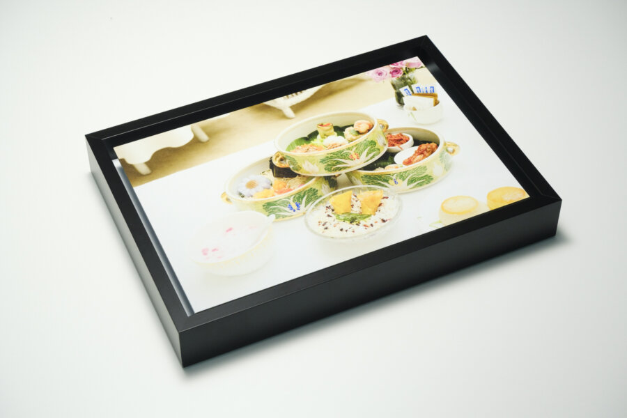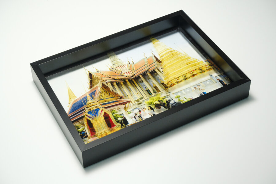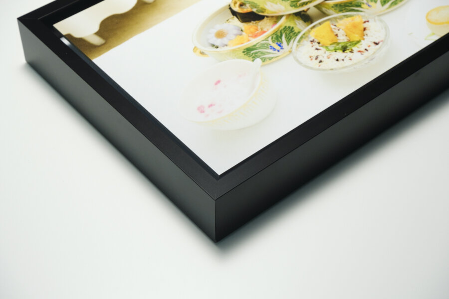 こちらは38mmと非常に奥行きのあるどっしりとしたフレームです。フレーム自体に深いスリットが設けられているため1〜2枚目のように浮かし額装を行うことが一般的ですが、FLATLABOでは3〜4枚目のように透け感のあるUVアクリルプリントを額装することが多いです。UVプリントアクリルの飾り方を迷われている方はぜひご検討ください。カラーはブラック・シルバーよりお選びいただけます。